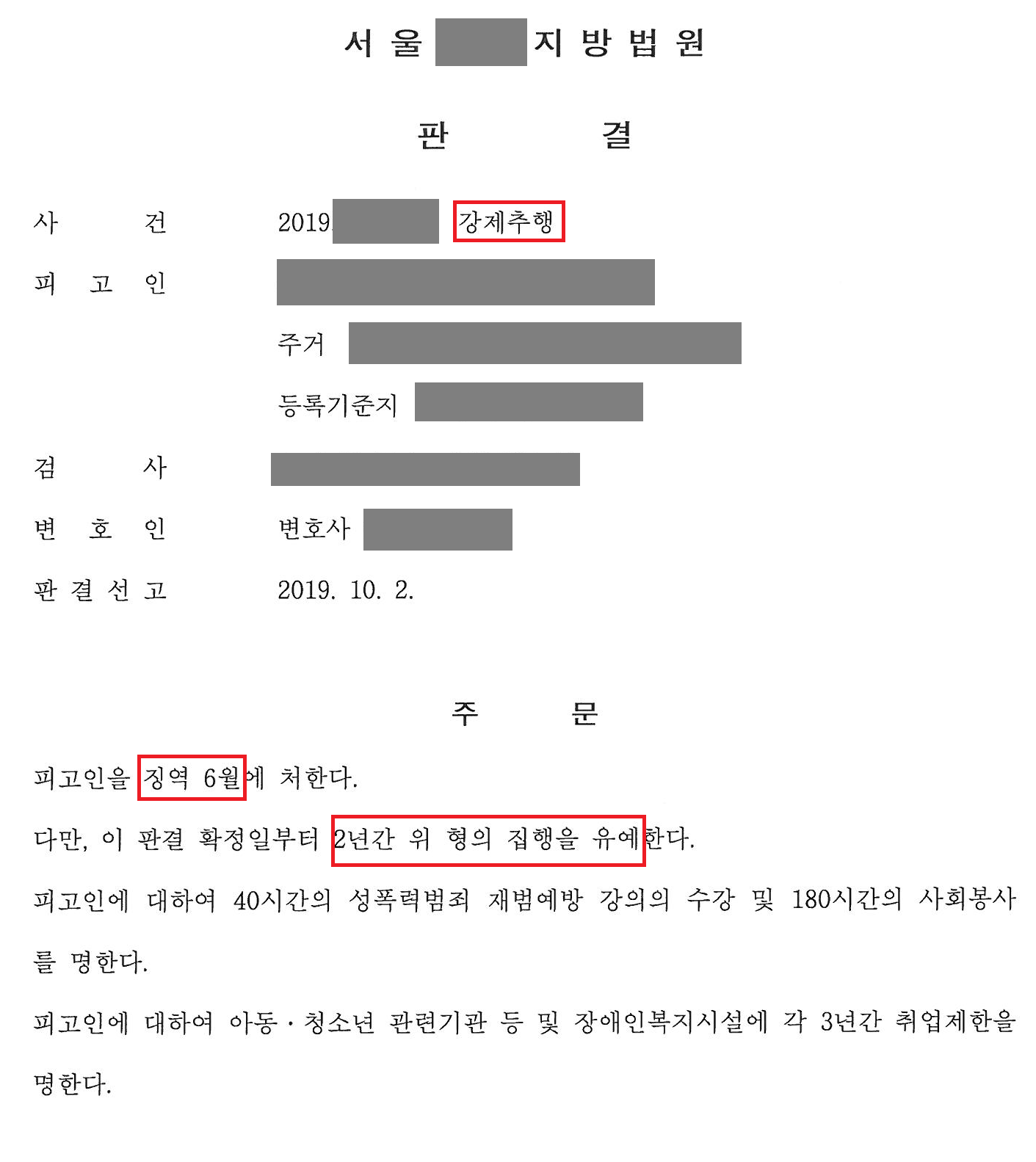 형사 사건에서 법원은 직장 상사의 강제추행 혐의를 유죄로 인정하고 징역 6월에 집행유예 2년, 40시간의 성폭력범죄 재범예방 강의 수강, 180시간의 사회봉사, 아동·청소년 관련기관 등 및 장애인복지시설에 각 3년간 취업제한이라는 판결을 선고하였습니다.