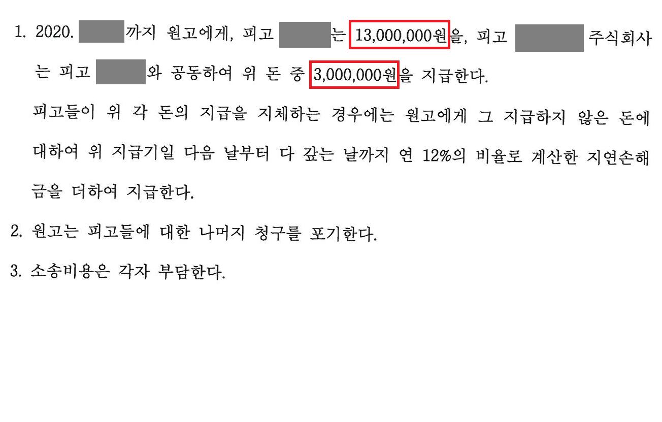 민사 소송에서 법원은 직장 상사는 1,300만원을, 회사는 직장 상사와 함께 의뢰인에게 손해배상으로 300만원을 지급하라는 판결을 선고하였습니다.