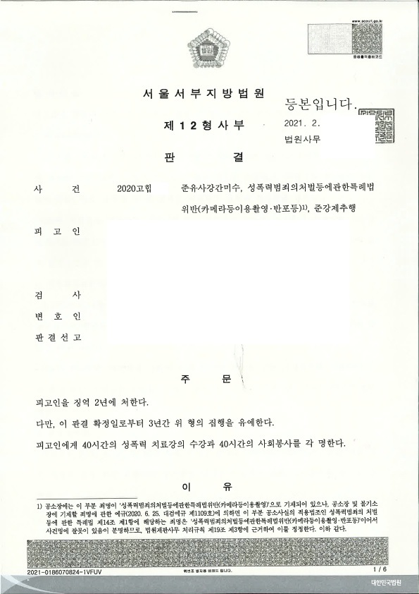 가해자는 범행 모두에 대해 유죄판결을 받았고 징역 2년 및 집행유예 3년의 형을 선고받았습니다. 초범이고 합의가 되었음에도 다소 중한 처벌을 받았으며 판결 이유에는 준유사강간미수에 관하여 '실제 피해자가 입은 피해 정도는 준유사강간기수와 다를 바 없다'라는 내용도 있었습니다.