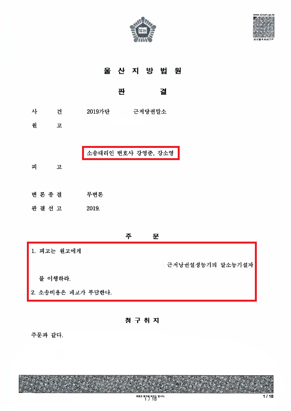 사무실의 조력을 통해 의뢰인의 청구가 모두 인용되는 무변론 승소판결이 선고되었고 위 판결이 확정되어 현재 설정된 근저당권의 말소까지 완료된 사안입니다.