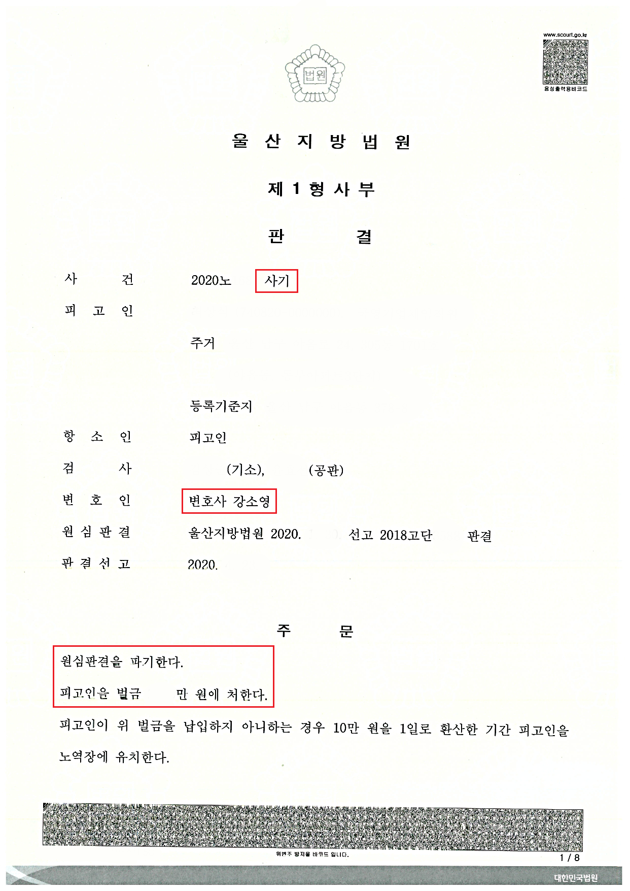 울산지방법원은 저희 사무실의 주장을 모두 받아들여 1심 판결을 전부 파기하였습니다. 저희 사무실의 주장대로 일부 피해금액(미수선수리비)에 대해서는 무죄로 판단하였고, 나머지 피해금액에 대해서는 피고인에게 유죄를 인정하되 벌금형을 선고하여 의뢰인께서 원하시던 최상의 결과를 얻을 수 있었습니다.