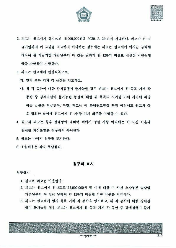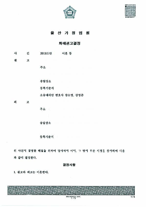 본 사건의 경우 재판부의 화해권고결정을 통하여 의뢰인의 이혼 청구, 위자료 청구 및 혼수품 인도 청구가 모두 인용되어 승소 판결을 얻을 수 있었습니다.