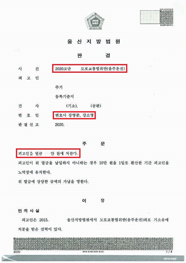 검사가 의뢰인에게 징역 2년을 구형하였음에도 불구하고 울산지방법원은 의뢰인의 상기 양형요소들을 받아들여 높은 혈중알콜농도에도 불구하고 의뢰인에게 벌금형을 선고하였습니다.