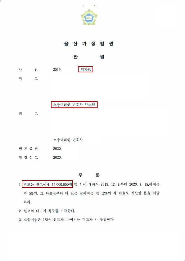 그 결과 울산가정법원은 의뢰인의 상간녀에 대한 위자료 청구를 받아들여 상간녀에게 1,500만 원의 위자료 지급을 명하였습니다.