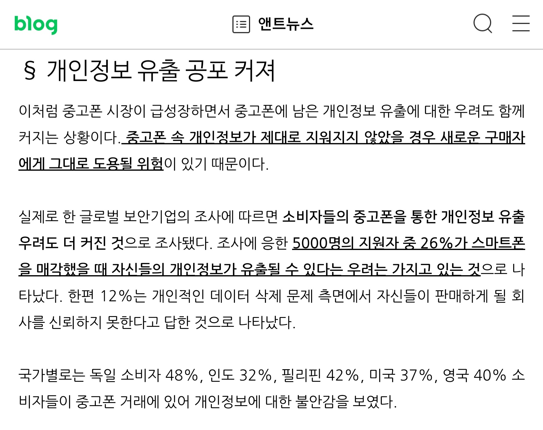 개인정보가 유출되어 명의가 도용당할까 우려되어 핸드폰을 버리는 사람들이 많다고 들었습니다. 버리는 것은 자원의 낭비이며 중고시세가 있음에도 그냥 버리는 경우 불리한 인상을 줄 수 있습니다.