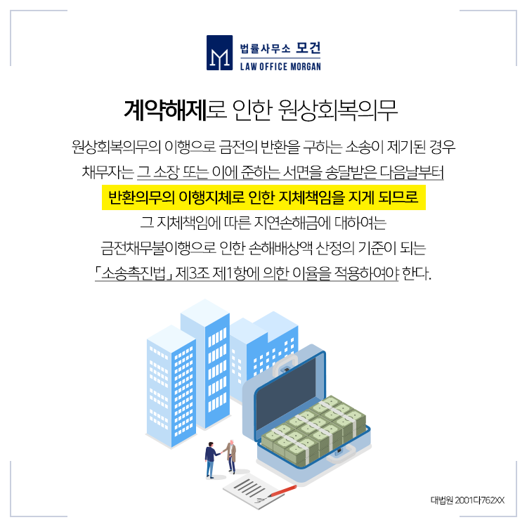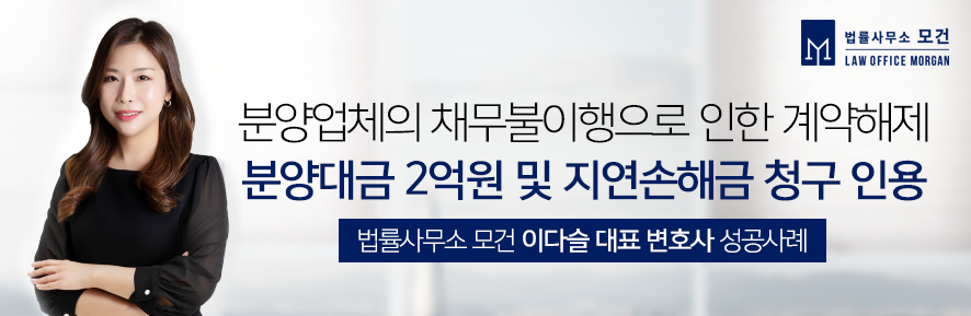 오늘 소개해드릴 이다슬 대표 변호사의 승소사례는 분양업체의 채무불이행으로 계약이 해제되어 그에 따른 원상회복의무로 분양대금과 지연손해금을 청구한 사례인데요. 상대방의 책임있는 사유로 계약의 이행이 불가능한 상황이라면 매수인은 매도인에게 계약해제를 통보함으로써 계약을 해제할 수 있고, 매도인은 원상회복의 의무를 가지기 때문에 매수인에게 받은 분양대금을 돌려주어야 합니다.