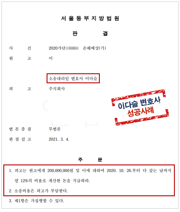 의뢰인의 승소로 지급한 2억원의 반환은 물론, 소장 부분 송달 다음날부터 다 갚는 날까지 연 12%의 지연손해금을 받을 수 있게 되었으며, 소송비용 또한 피고회사 부담으로 승소할 수 있었습니다.