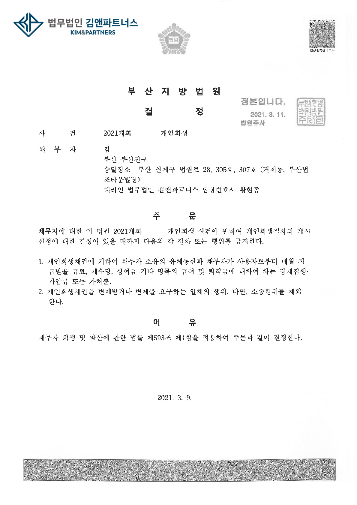 의뢰인은 금지명령을 받고 급여압류 등의 위험에서 벗어나 개인회생절차를 무사히 진행할 수 있을 것입니다.