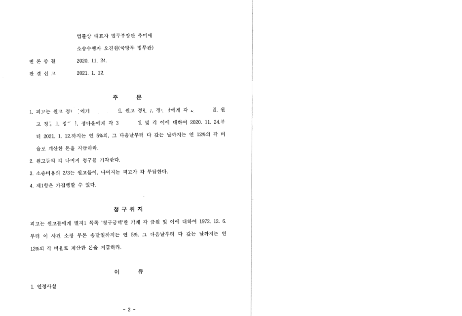 그 동안 긴급조치위반과 관련한 국가배상사건은 종종 있어왔으나 비상계엄 관련한 국가배상이 인정된 것은 처음이 아닌가 싶습니다. 19살의 대학 1학년 때의 일로 가족들과 본인의 삶에 많은 영향이 있었고 뒤늦게나마 국가로 하여금 배상책임을 인정한 사건의 원고를 소송대리하였습니다.(서울중앙지방법원 2020가단5016368)