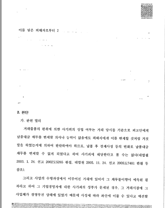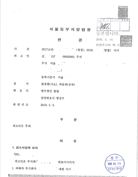 변호사 활동을 하면서 형사사건에서 '무죄'를 선고받는 경험만큼 보람 있는 일은 없을 것입니다. 특히 정말 억울하다고 생각되는 피고인일 경우에는 더더욱 그러하죠. 기계설비업체를 운영하는 피고인이 4군데 업체로부터 사기로 고소를 당한 사건이었고, 피고인은 업체를 운영하다가 도저히 더는 회사 운영이 어려워 법인파산을 신청했는데 이로 인해 자재대금을 받지 못하게 된 업체들이 사기로 고소를 하였고 검찰에서는 모두 기소를 하였습니다. 피해액이 1억 5천 정도 되는 사건이었고 특히나 피고인이 저랑 한 동네에 거주하시는 분으로 오랜 기간 알고 지내던 분이었기에 법정구속이 되면 어떻게 하나 노심초사하면서 변론을 진행했었습니다. 의도적으로 법인파산을 한 것이 아니고 정말로 어쩔 수 없이 파산신청을 하게 된 것임을 강하게 어필을 하였고 판결문을 받아보니 이런 변론에 재판부도 수긍을 한 것으로 보였습니다. 개인이든 법인이든 현행 법상 파산제도가 존재하고 파산제도의 속성 상 부득이하게 선의의 피해자가 생길 수 밖에 없는 제도적 조건이 있습니다. 그렇기 때문에 이러한 파산신청을 하였다고 하여 '사기죄'가 되는지 여부에 대하여는 좀 더 신중한 접근이 필요하다고 생각합니다.