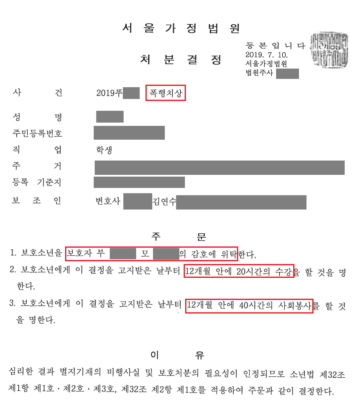 저의 조력 덕분에 의뢰인의 사건은 소년보호사건으로 송치되었고 어떠한 처벌 기록이나 전과도 남지 않도록 가정법원에서 재판을 받게 되었습니다. 피해자 측의 완강한 거부 의사로 인해 끝내 합의가 이루어지지 않았음에도 의뢰인은 부모님의 감호에 위탁하는 처분(1호), 20시간의 수강명령(2호), 40시간의 사회봉사(3호) 처분만을 받고 모든 사건을 종결시킬 수 있었습니다.