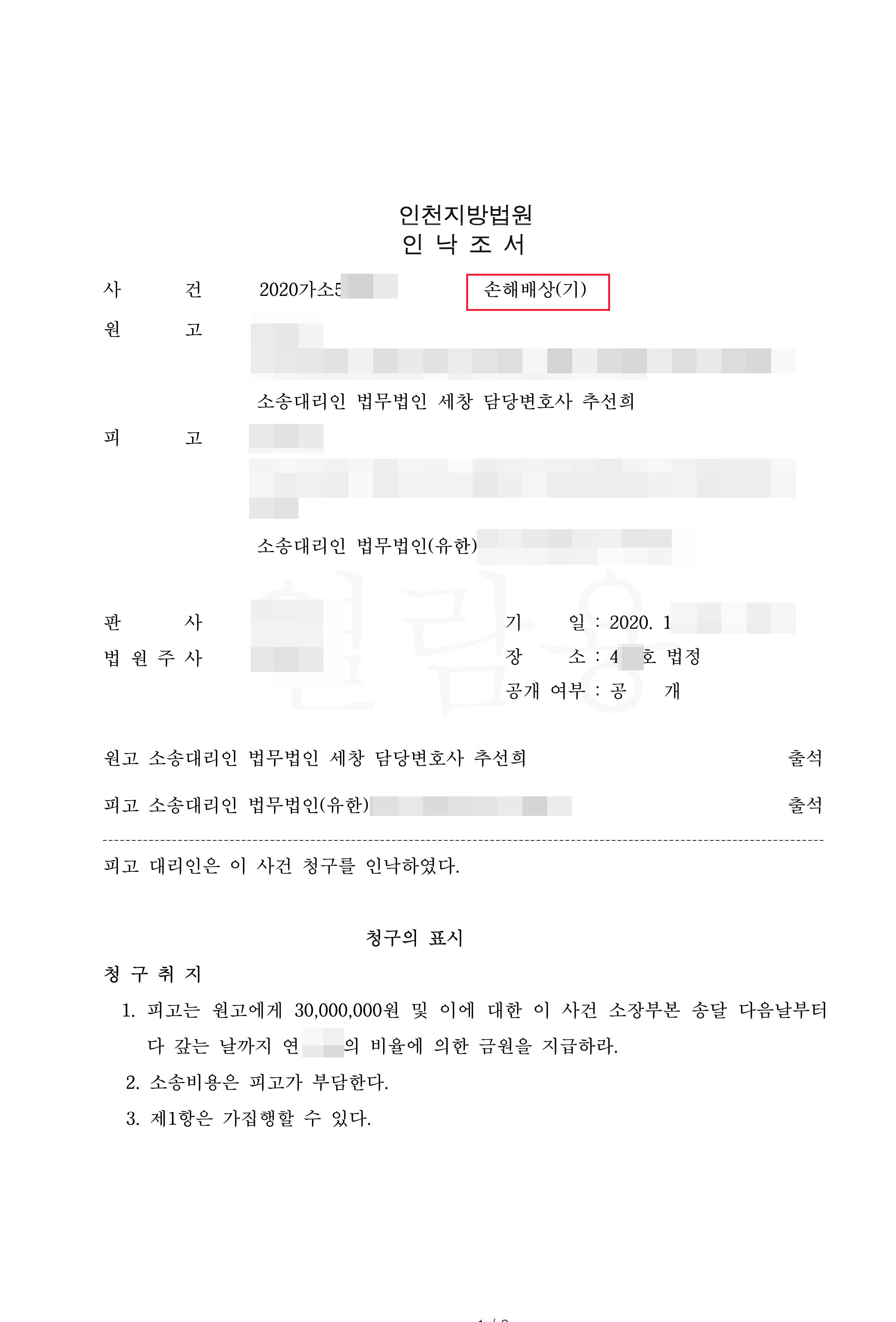 이 사례 역시 의뢰인이 본변호인에게 사건을 위임하여 소송을 제기하였으나, 피고측이 의뢰인의 청구가 이유있다고 인정하여 청구인낙으로 소송이 종료된 사건이었습니다.