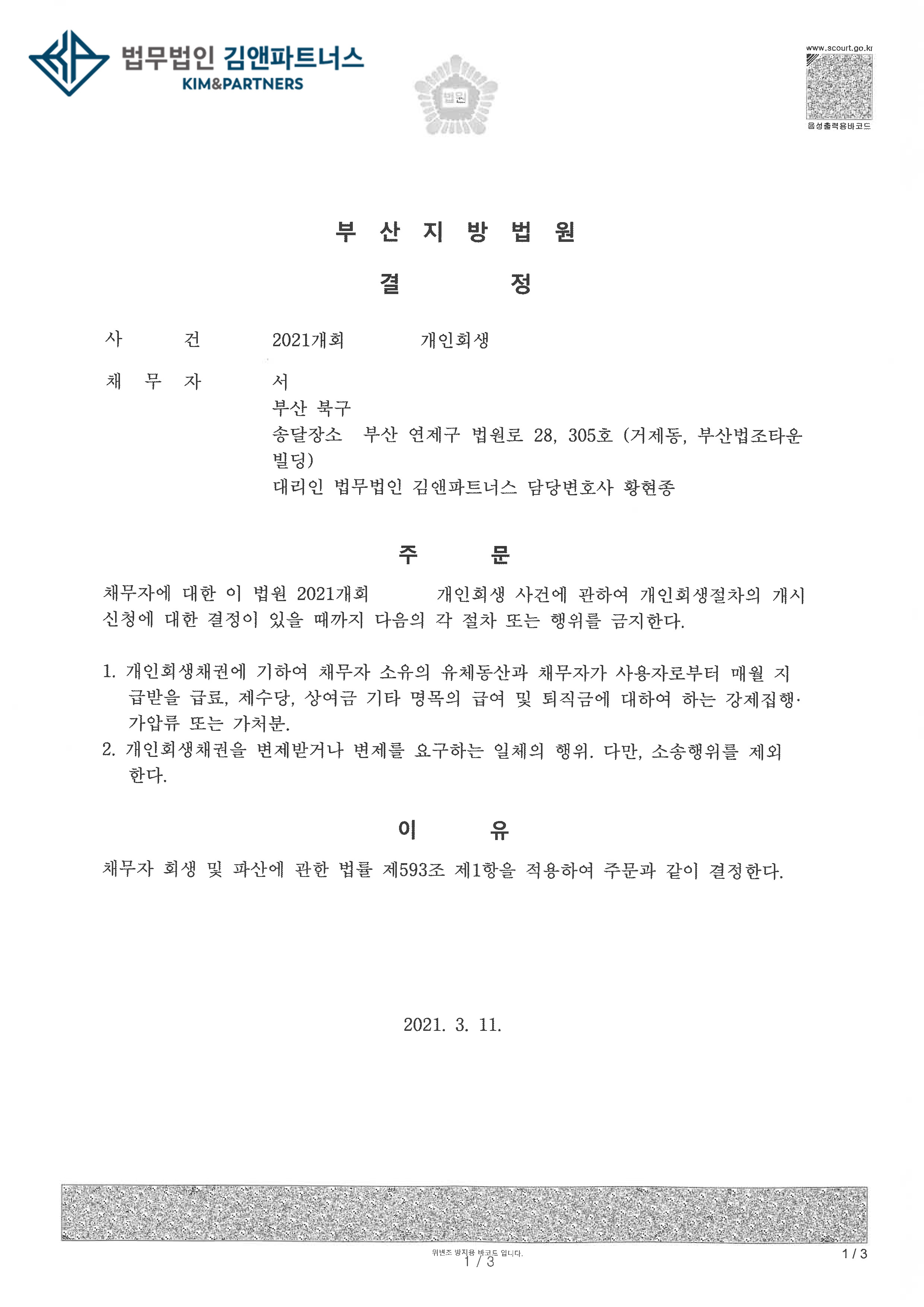 의뢰인은 금지명령을 받고 급여압류 등의 위험에서 벗어나 개인회생절차를 무사히 진행할 수 있을 것입니다.