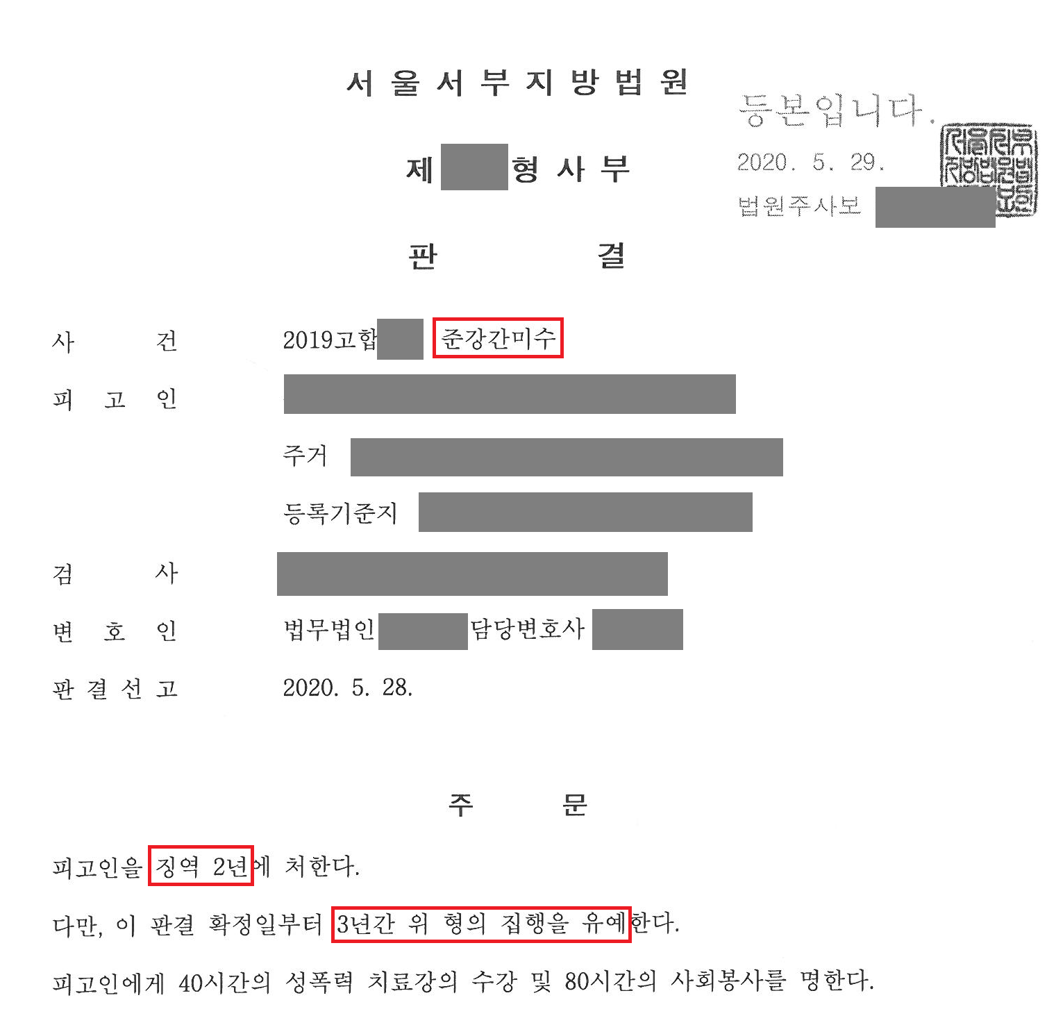 법원은 가해자에게 준강간미수 혐의를 인정하고 징역 2년, 집행유예 3년, 40시간의 성폭력 치료강의 수강, 80시간의 사회봉사를 선고하였습니다. 가해자는 20대 초반의 초범이었음에도 엄벌에 처해질 수 있었고, 의뢰인은 별도로 가해자와의 합의를 통해 2,000만원의 합의금을 수령하였습니다.