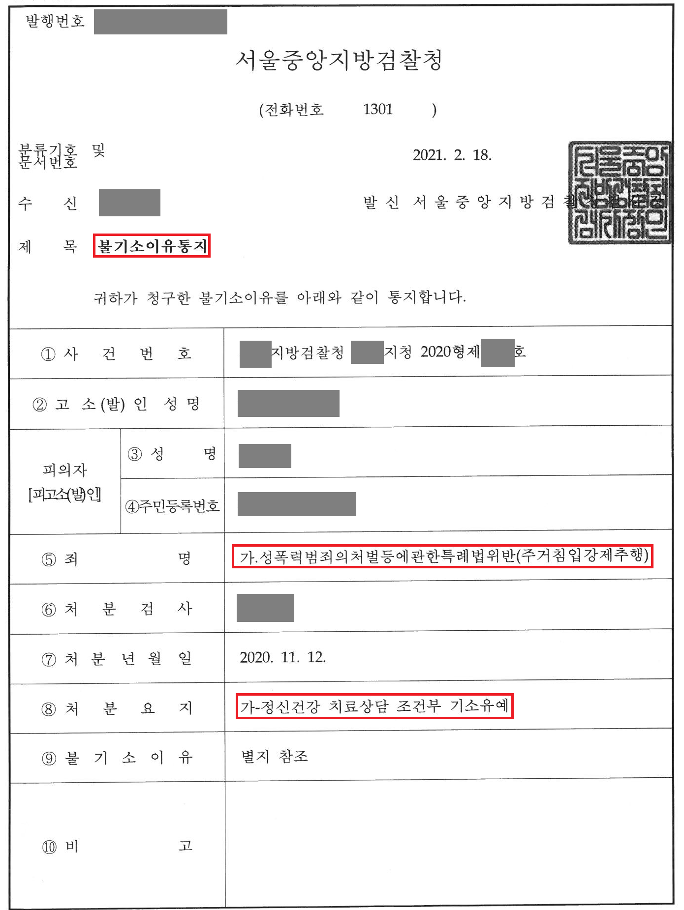 저는 피해 여성들 모두와 합의를 성공시켰고, 너무 긴장한 나머지 거짓말 탐지조사 결과가 거짓반응이 나왔음에도 불구하고 검찰로부터 정신건강 치료 상담을 하는 조건으로 기소유예 처분을 받았습니다. 법정형이 무기징역 또는 7년 이상의 징역으로 정해져있는 범죄에서 불기소처분을 받은 것으로, 덕분에 의뢰인은 아무런 성범죄 전과 기록 없이 일상으로 복귀할 수 있었습니다.