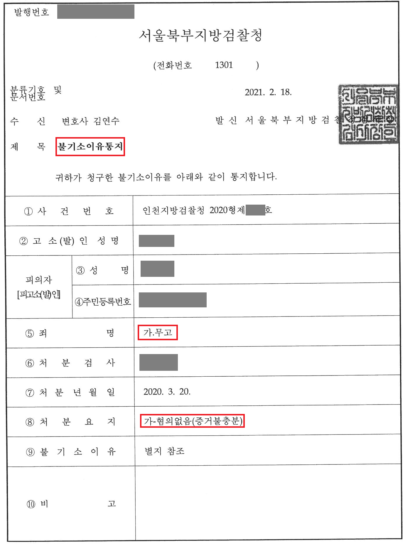 검찰은 저의 변론을 받아들여 무고 혐의에 대해 불기소처분을 내렸습니다. 덕분에 의뢰인은 이웃 사람으로부터 폭행을 당한 것도 억울한데 이를 용서해 주었다가 오히려 무고죄로 처벌받을 뻔했던 위기에서 벗어날 수 있었습니다.