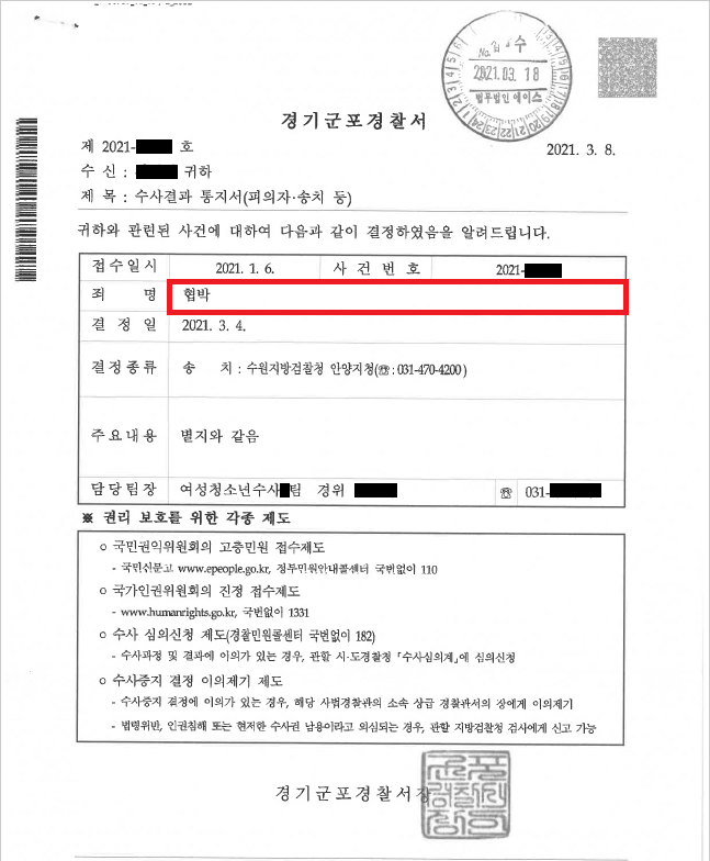 이러한 저의 조력을 바탕으로 A씨는 성폭력범죄의처벌등에관한특례법위반(카메라등이용촬영) 혐의에 대해서는 '불송치(혐의없음)' 결정을, 성폭력범죄의처벌등에관한특례법위반(촬영물등이용협박) 혐의에 대해서는 '협박' 부분만 '송치' 결정을 각 받음으로써, 억울한 누명에서 벗어날 수 있었습니다.