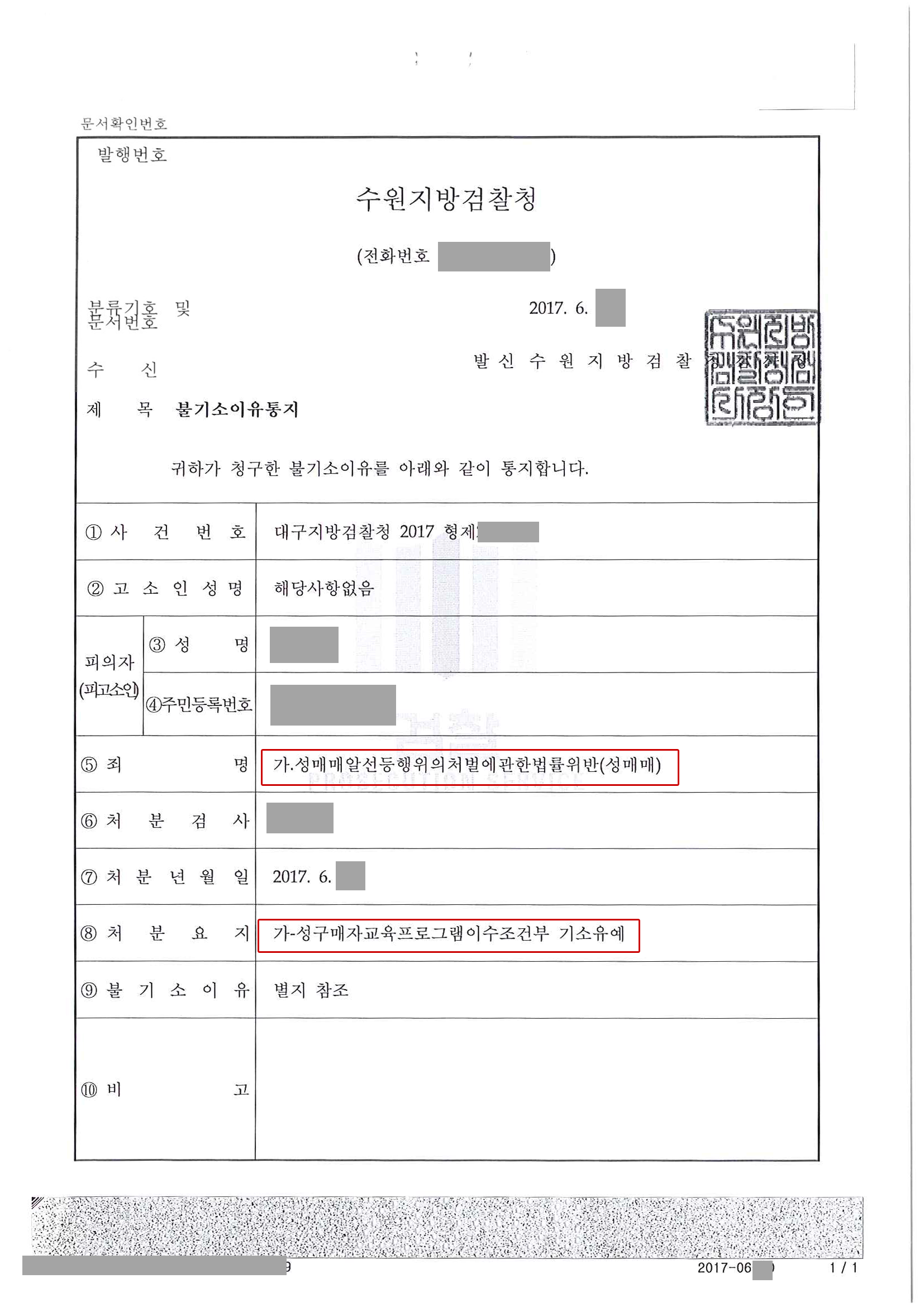 의뢰인은 대구출장 당시의 채팅기록과 어플리케이션을 이미 삭제한 상황이었습니다. 또한 화대지불을 위해 오후 10:30분경 ATM를 사용한적이 있었지만 이를 기억하지 못하고 혐의를 전면 부인하다가 오히려 수사기관의 추궁에 제대로 답변을 하지 못한 상태였습니다. 게다가 의뢰인은 과거 사기혐의로 불기소처분을 받은 사례가 있었기 때문에 처벌의 공포가 매우 큰 상황이었습니다. 이후 사건을 맡아 사실관계를 분석하였고 특히 수사기관이 제시하는 채팅기록을 면밀히 살펴보았습니다. 채팅기록에서는 의뢰인이 먼저 대화를 시도하였고 화대 협상 및 방문시각까지 구체적으로 확보되있는 것을 확인하였습니다. 이정도로도 실무상 성매매 유죄입증에는 큰 무리가 없어보였기 때문에 굳이 법적다툼을 하기 보다는 초범인 점을 적극 활용하여 불기소처분을 받는 방향이 나을 것이라는 조언을 하였습니다. 이에 의뢰인은 혐의를 전면인정하고 탄원서를 검찰에 제출하였습니다. 이에 검찰은 의뢰인이 성매매 관련 전과는 없는 점, 처벌의 필요성이 적은 점 등을 고려하여 성구매자교육프로그램이수조건부 기소유예 처분을 내렸습니다.