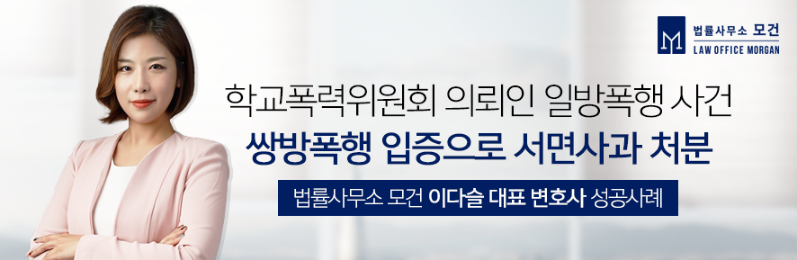 학폭위변호사인 이다슬 대표 변호사는 의뢰인 측 변호사로 선임되어 CCTV확보, 현장 아이들의 증언 등을 적극 확보함으로써 일방폭행이 아닌 쌍방폭행임을 입증해내었습니다. 이에 따라 피해학생 역시 가해학생 자격이 되어 양측 모두 가장 경미한 1호 처분인 서면사과로 사건을 마무리 할 수 있게 되었습니다.