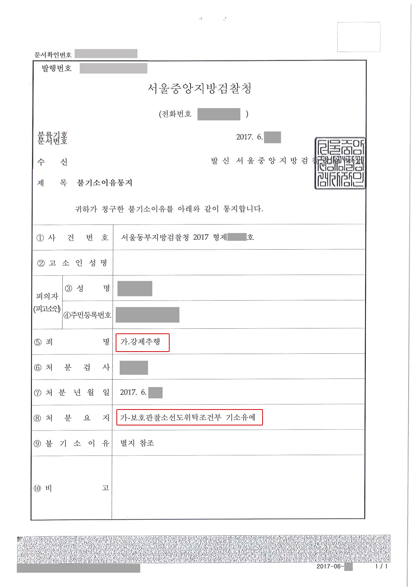 사실관계 분석과 동시에 수사기관과의 신뢰와 피해자 측 변호인과의 수시적인 연락을 진행하였습니다. 의뢰인의 아버지는 무죄를 간하기 주장하고 있었지만 피해자 측에서는 사건당시 10일간의 치료가 요구되는 찰과상 진단서와 정신적 충격으로 인한 정신과 치료기록 등을 제출한 상황이었습니다. 게다가 이미 현행범으로 입건될 당시 관할 지구대 1차 조사에서 의뢰인 스스로가 강제추행 사실을 인정했기 때문에 진술을 번복하고 법정다툼을 하는 것은 매우 위험한 소지가 있었습니다. 사건 재구성, 친모와의 비동거, 결손가정에서의 정서적 불안, 피해 여성 측 합의서 제출 등을 통해 기소유예 처분을 주장했습니다. 이에 검찰은 의뢰인의 보호감호 필요성, 연령 등을 감안하여 보호관찰소선도위탁조건부 기소유예 처분을 내렸습니다.