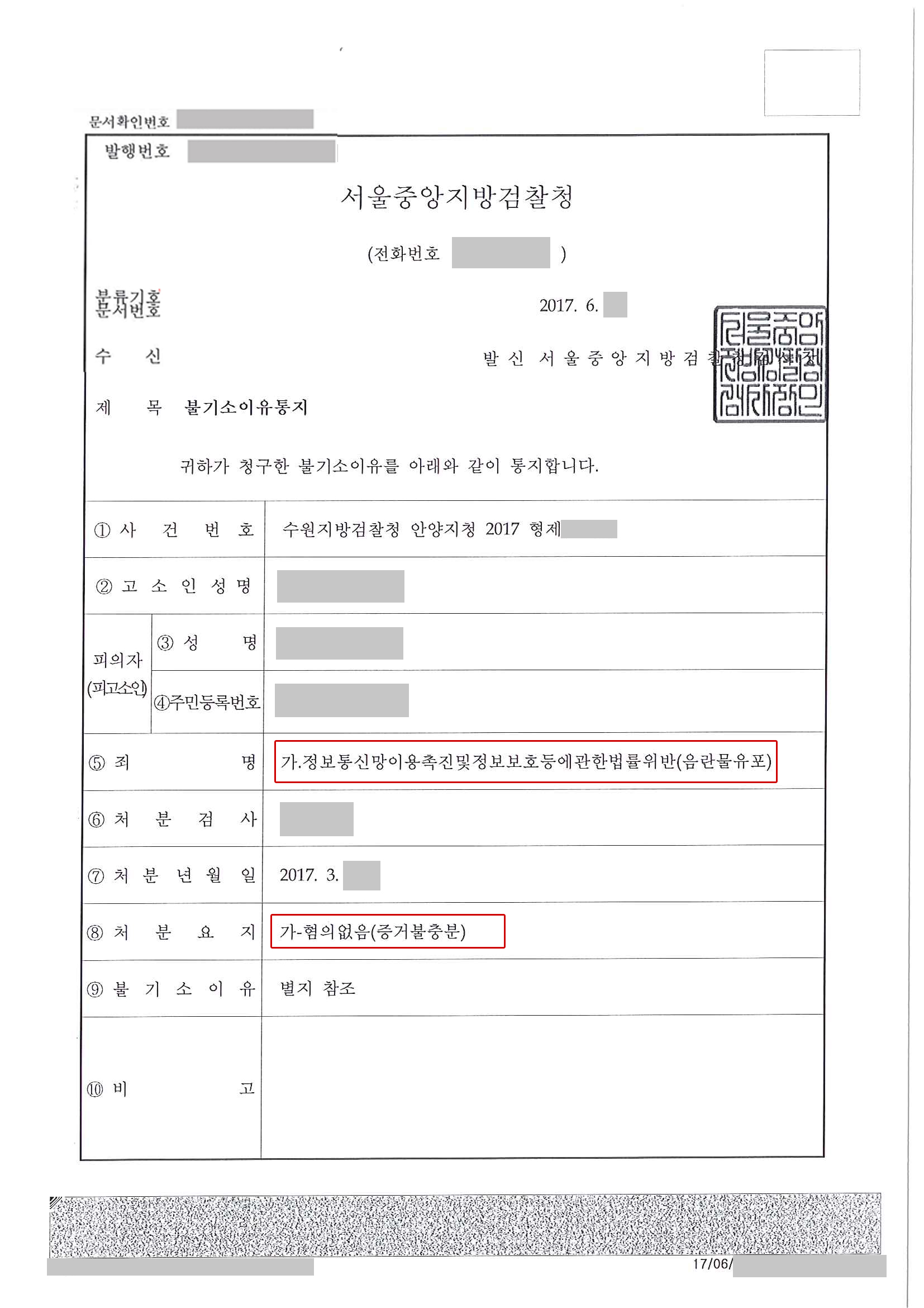 야한유머자료가 이미 불특정다수에 도달했기 때문에 이 자체에 대한 다툼보다는 의뢰인이 송부한 내용이 타인에게 성적수치감을 유발할 정도는 아니라는 객체성 부정 전략을 사용하기로 하였습니다. 이에 정보통신망법 음란물 유포죄 관련 판례를 분석하여 음란물 판단 사례를 취합하고 최근 지방법원 판례에 중점을 두었습니다. 이를 바탕으로 의뢰인이 스마트폰을 조작하여 특정내용을 공유한 것은 맞으나 이미 티비 등에서 많이 다루어지는 30대 이상의 성인들이 웃고 즐길 수 있을 정도의 내용임을 들어 음란물유포죄가 성립하지 않는다는 변론을 진행하였습니다. 이에 검찰은 의뢰인이 공유한 글내용은 음란물로 평가할 수 없다고 보고 혐의없음(증거불충분) 처분을 내렸습니다.