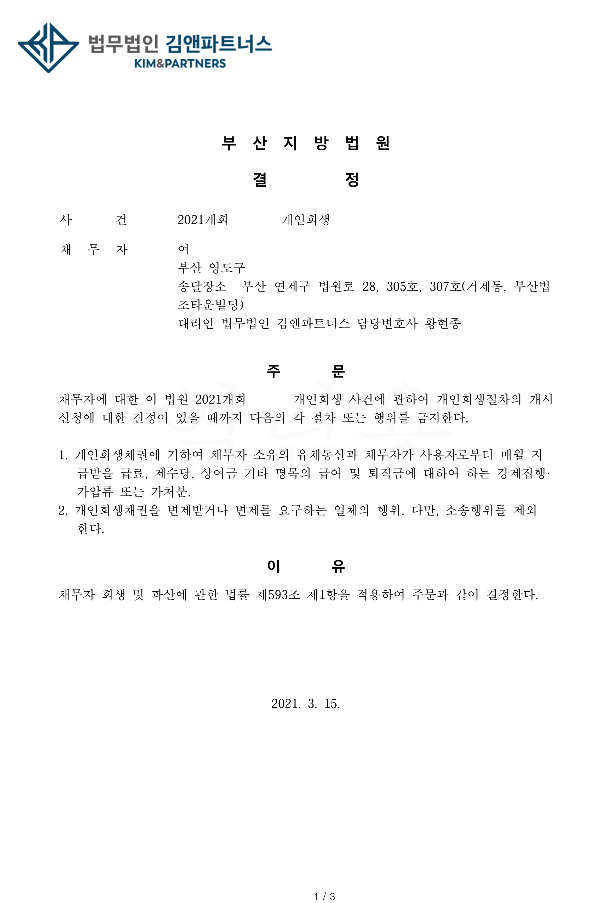 의뢰인은 금지명령을 받고 급여압류 등의 위험에서 벗어나 개인회생절차를 무사히 진행할 수 있을 것입니다.