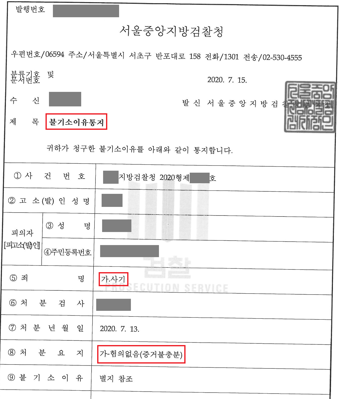 만일 기소가 되었다면 의뢰인은 형사처벌을 받을 뿐만 아니라 민사소송을 통해 원금에 이자까지 반환을 해야 하는 상황이 발생할 수 있었으나, 다행히 검찰은 저의 변론을 받아들여 의뢰인의 사기 혐의에 대해 불기소처분을 하였습니다.