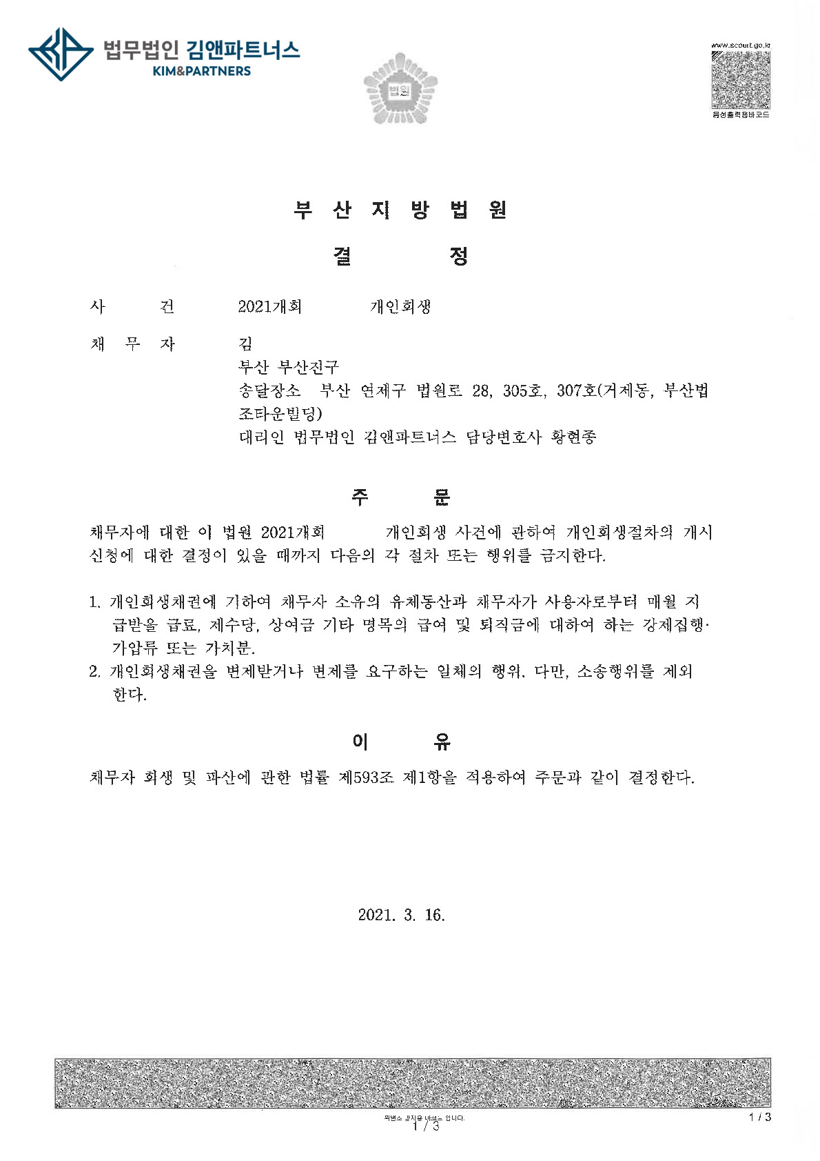 의뢰인은 금지명령을 받고 급여압류 등의 위험에서 벗어나 개인회생절차를 무사히 진행할 수 있을 것입니다.