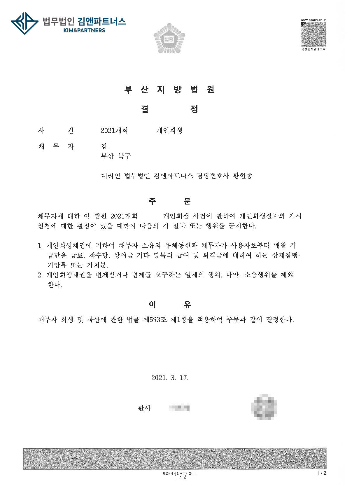 의뢰인은 금지명령을 받고 급여압류 등의 위험에서 벗어나 개인회생절차를 무사히 진행할 수 있을 것입니다.