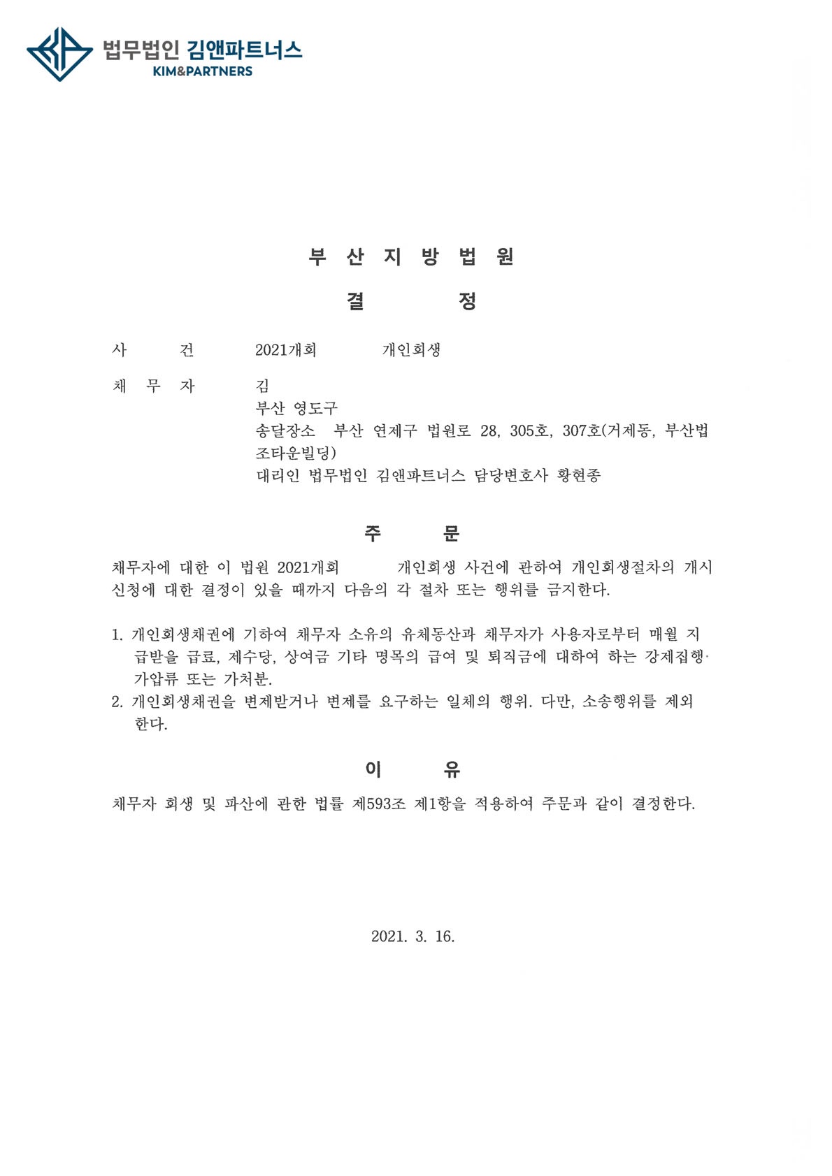 의뢰인은 금지명령을 받고 급여압류 등의 위험에서 벗어나 개인회생절차를 무사히 진행할 수 있을 것입니다.
