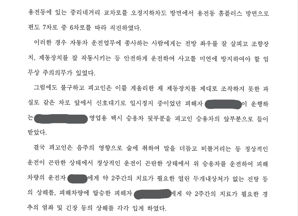 피고인(의뢰인)은 2020. 1.경 지인과 술을 마신 후 자차를 운전해 귀가하다가 신호대기 중인 택시를 뒤에서 충격하였고, 이로 인해 택시 운전사 및 승객에게 각 전치 2주의 상해를 입혔습니다.