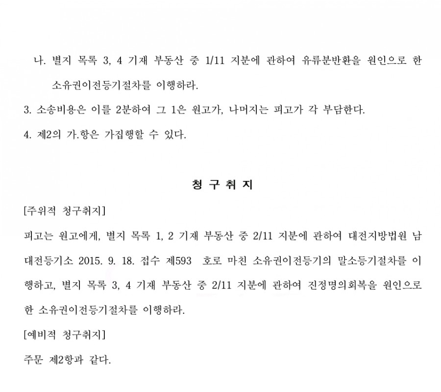 원고는 주위적으로 망 0 0 0 사망하기 전, 섬망상태에 있어 입원 기간 중 정상적인 사리분별력을 보유하고 있었다고 볼 수 없으므로, 망인과 피고 사이에 2015. 9. 10. 체결된 증여계약은 모두 무효이고, 원고는 예비적으로 이 사건 증여로 인하여 원고의 유류분이 침해 되었음을 주장하며 유류분반환의 방법으로 피고에게 별지목록 제1, 2 기재 부동산에 대하여는 원고의 유류분 1/11 지분 가액에 해당하는 금액인 31,818,181원의 지급을, 별지목록 제3, 4 기재 토지에 대하여는 원물반환으로 1/11 지분 이전등기절차의 이행을 구하였습니다.
