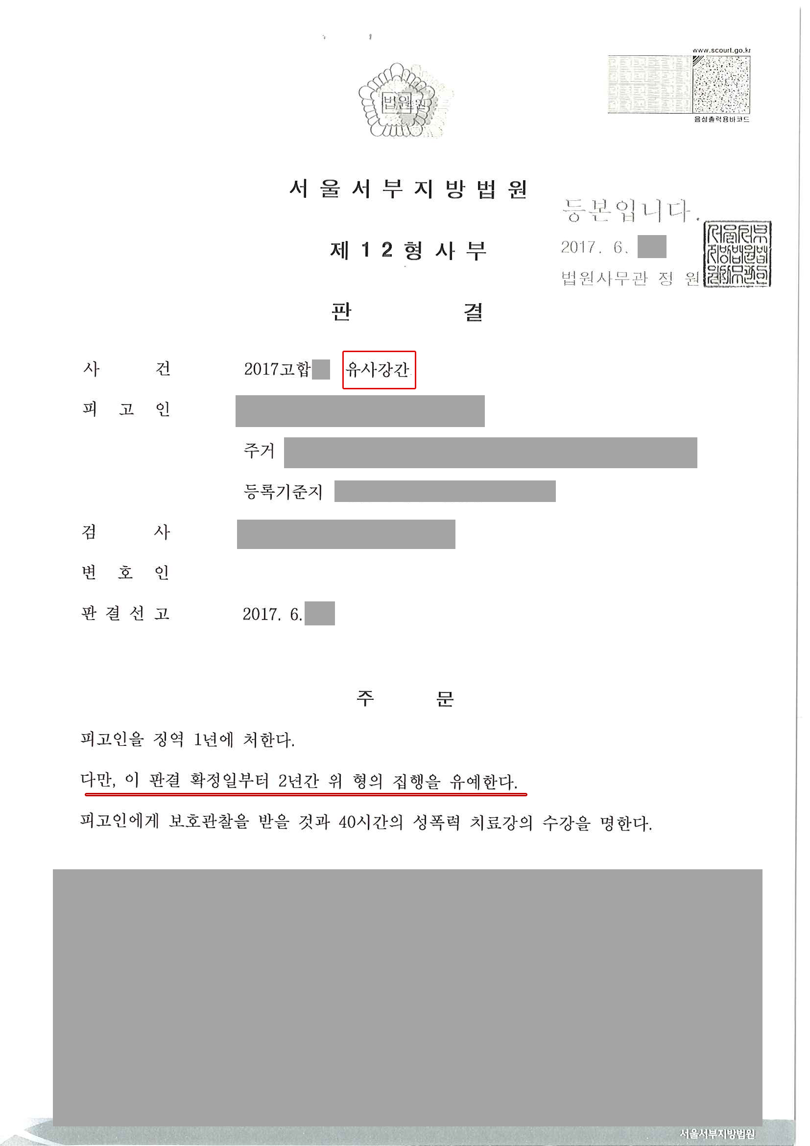 의뢰인은 경찰조사에서 피해자와 자신은 교제하는 사이이며 교제하는 사이에서 성관계도 아닌 성기에 대한 여러 접촉을 이유로 처벌하는 게 말이 되냐며 항의를 하였습니다. 또한 내심 DVD방 내부의 상황은 아무도 본 사람이 없었기 때문에 자신의 혐의를 증명하지 못할 것이라는 자신감도 깔려있었습니다. 하지만 수사기관은 다음의 이유로 의뢰인에게 유사강간 혐의를 인정하고 법원에 의뢰인을 기소하였습니다. 피해자가 제출한 자료를 보면 사건 전부터 의뢰인이 여려 차례 성관계를 요구하였지만 피해자가 거절의사를 명확히 밝힌 카톡 메시지, 사건직후 DVD방 카운터 직원이 브래지어 끈이 보일정도로 옷을 입지 못한 채 밖으로 뛰어나간 피해자를 목격한 사실, 사건 직후 피해자가 울면서 부모에게 전화를 하였고 이를 부모가 녹음한 녹취파일, 스마트워치 브랜드의 정확한 인지, 촉감, 삽입횟수 등을 상세히 진술한 내용들이 포함되어 있었습니다. 실무 경험상 이정도의 피해자 진술과 관련 증거가 있는 경우 무죄선고를 받는 것은 사실상 불가능에 가깝다고 판단 조속히 피해자 측 변호인과 협의를 통해 불처벌 의사 진술서를 받아 법원에 제출하였습니다. 또한 의뢰인이 다소 잘못된 행동을 한 것은 있으나 혈기왕성한 나이에 사실상 교제관계에 있는 여성과 성적 접촉을 하고 싶다는 욕구를 제대로 제어하지 못한 점 등을 참작해 달라는 변론서를 법원에 제출하였습니다. 이에 법원은 의뢰인이 고의를 가지고 강제적으로 유사강간을 한 것은 맞으나 피해자측도 경미한 수준의 스킨십에 대한 동의는 있었던 점, 교제하는 사이였던 점, 처벌을 원치 않았던 점 등을 고려하여 집행유예 선고를 내렸습니다.