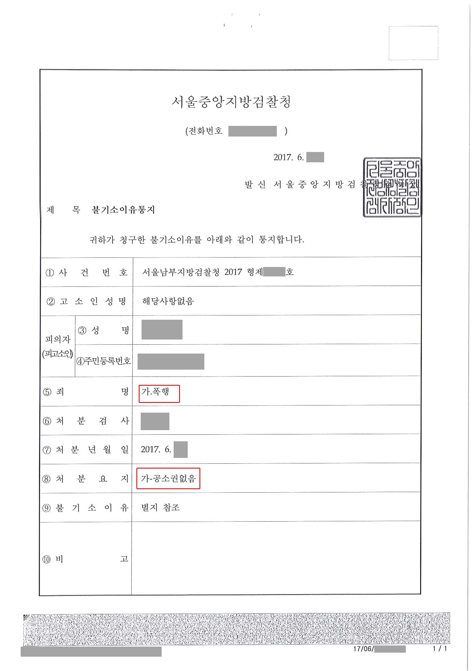의뢰인은 자신이 먼저 머리채를 잡혔기 때문에 절대 상대방을 용서할 생각이 없고 정당방위라고 주장을 하였습니다. 하지만 수많은 폭행죄 관련 사건을 다루어본 시각에서는 비록 의뢰인이 억울한 측면이 있다 하더라도 얼굴을 1회도 아닌 수차례 가격한 것은 매우 적극적 공격의사로 인정될 가능성이 있다고 판단하였습니다. 또한 합의를 원하는 피해자 측과 달리 자신의 무혐의만 주장하다가는 유죄선고를 피하지 못할 수도 있다는 판단아래 서로간의 불처벌의사원 제출을 권유하였습니다. 의뢰인은 피해자가 먼저 자신들의 음식준비 돗자리를 망가트렸고 이에 대한 사과의 의사표시도 전혀 없어서 말싸움과 다소의 몸싸움이 있었을 뿐 결코 폭행의 고의는 없었다고 주장하였습니다. 피의자 심문조서와 피해자 측 진술 내용을 종합 검토하였고 그 결과 최초 분쟁이 촉발된 이유는 피해자 측이 맞았지만 폭행을 먼저 시도한 것은 의뢰인임을 부정하기는 어렵다고 판단하였습니다. 특히 의뢰인이 1명만이 아닌 여러 사람에게 폭력과 발길질을 행사하였고 이로 인해 1인에게는 출혈의 상처까지 발생시킨 이상 향후 형사절차 진행에 따라 상해죄로 적용혐의가 올라갈 가능성을 배제할 수 없었습니다. 피해자 측 변호인과 협의하여 고소를 취하하도록 하여 검찰 단계에서 사건을 종결시키는 것이 합리적이라는 판단을 하여 이를 진행하였습니다. 이에 검찰은 쌍방이 불처벌 의사를 밝힌 만큼 기소충족 요건이 부존재한다는 이유로 공소권없음 처분을 결정했습니다.