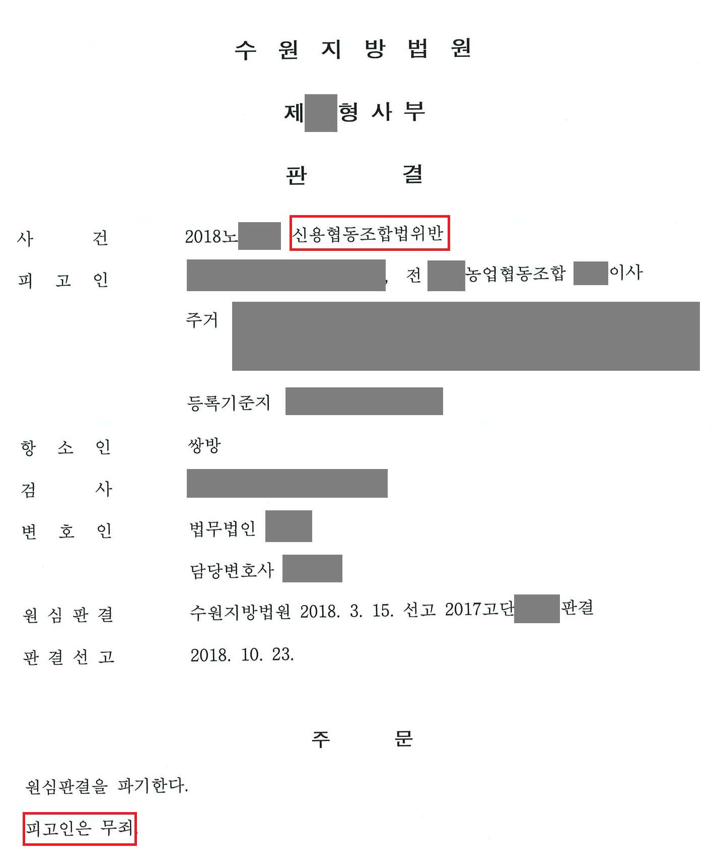 의뢰인은 지역농협의 임원으로 여신업무를 담당하고 있었는데, 한 명의 사업자를 통해 각각 3명에게 총 30억 원의 대출을 해주었습니다. 그런데 사실은 3명의 명의를 빌려서 그 사업자가 모든 대출을 받은 것이었고, 이것은 해당 사업자에게 설정되어 있는 대출한도 21억 원을 9억 원이나 초과한 것이었습니다. 결국 의뢰인은 신용협동조합법 위반으로 재판을 받게 되었고 1심에서 징역 6월에 집행유예 2년이 선고된 상태였습니다.