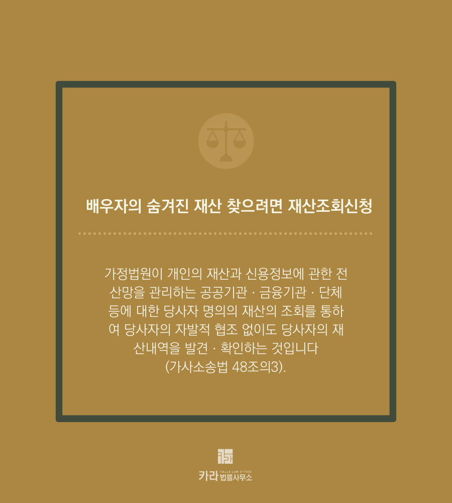 가정법원이 개인의 재산과 신용정보에 관한 전산망을 관리하는 공공기관ㆍ금융기관ㆍ단체 등에 대한 당사자 명의의 재산의 조회를 통하여 당사자의 자발적 협조 없이도 당사자의 재산내역을 발견ㆍ확인하는 것입니다(가사소송법 48조의3).
