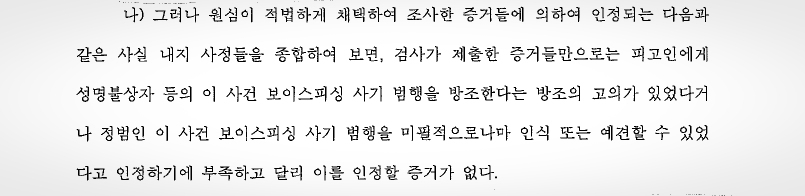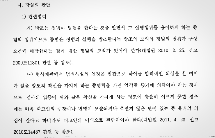 즉 항소심 재판부는 방조범의 경우에도 정범의 행위가 구성요건에 해당한다는 점에 대한 정범의 고의가 필요하다는 점을 인정하고, 형사재판에서 범죄사실의 인정은 법관으로 하여금 합리적인 의심을 할 여지가 없을 정도의 확신을 가지게 하는 엄격한 증거에 의하여만 인정된다고 판시하면서, 감사가 제출한 증거들만으로는 피고인에게 보이스피싱 사기 범행을 방조한다는 방조의 고의가 있었다거나 정범인 보이스피싱 사기 범행을 미필적으로나마 인식 또는 예견할 수 있었다고 인정하기에는 부족하다고 판단을 하였습니다.