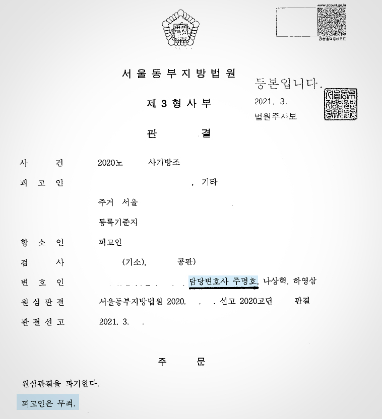 실제 이 사건의 모든 잘못은 보이스피싱 조직에 의하여 이루어진 것이고, 보이스피싱 피해자나, 의뢰인 역시 피해자인데 안타깝게도 보이스피싱 조직은 잡지 못하고, 피해자끼리 소송을 진행하는 안타까운 판례입니다. 항소심 법원도 의뢰인에게 업무를 지시한 보이스피싱 조직의 총책이나 관리책에 대한 조사가 이루어지지 않고, 피고인에게 사기 방조의 죄책을 묻는 것이 합당한지에 대한 고민이 있었고, 관련 증거들을 토대로 의뢰인에게 문제를 선고하게 되었습니다.