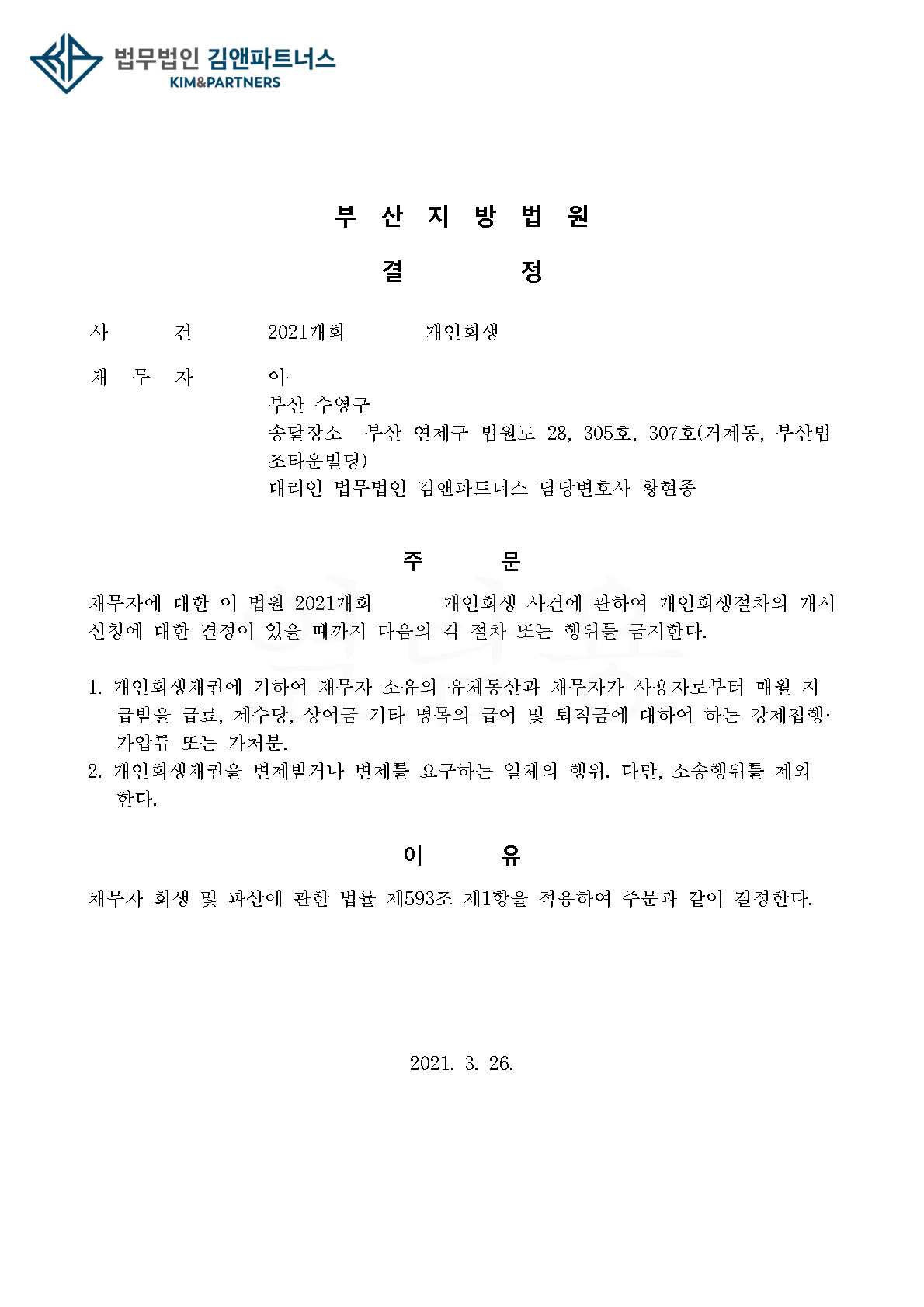 의뢰인은 금지명령을 받고 급여압류 등의 위험에서 벗어나 개인회생절차를 무사히 진행할 수 있을 것입니다.