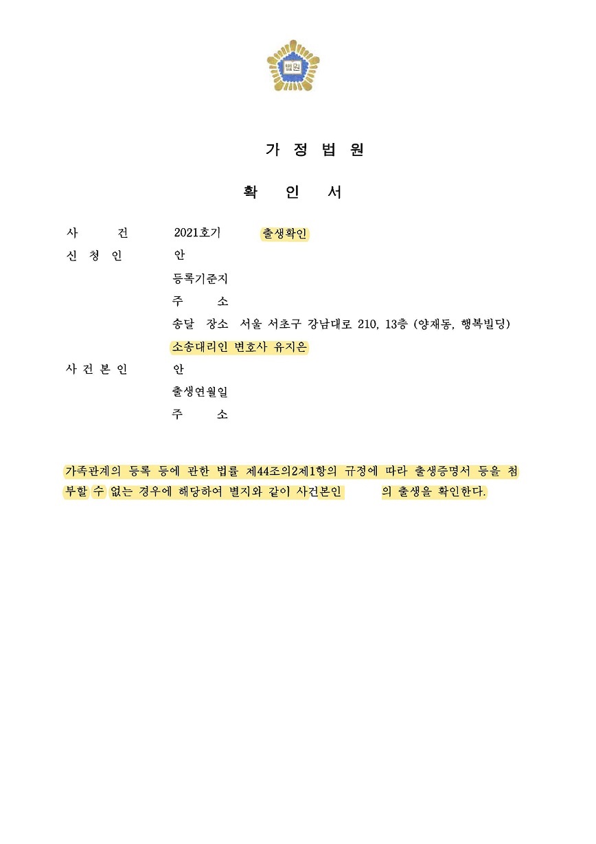 이에 우선적으로 친자관계 판결에 의해 등록부가 폐쇄된 경우인지 여부를 확인하였고, 이 경우에 해당하지 않아 어머니의 도움을 받아 출생증명서를 발급받을 수 없는 사유를 소명하여 법원에 출생확인신청을 하였습니다.