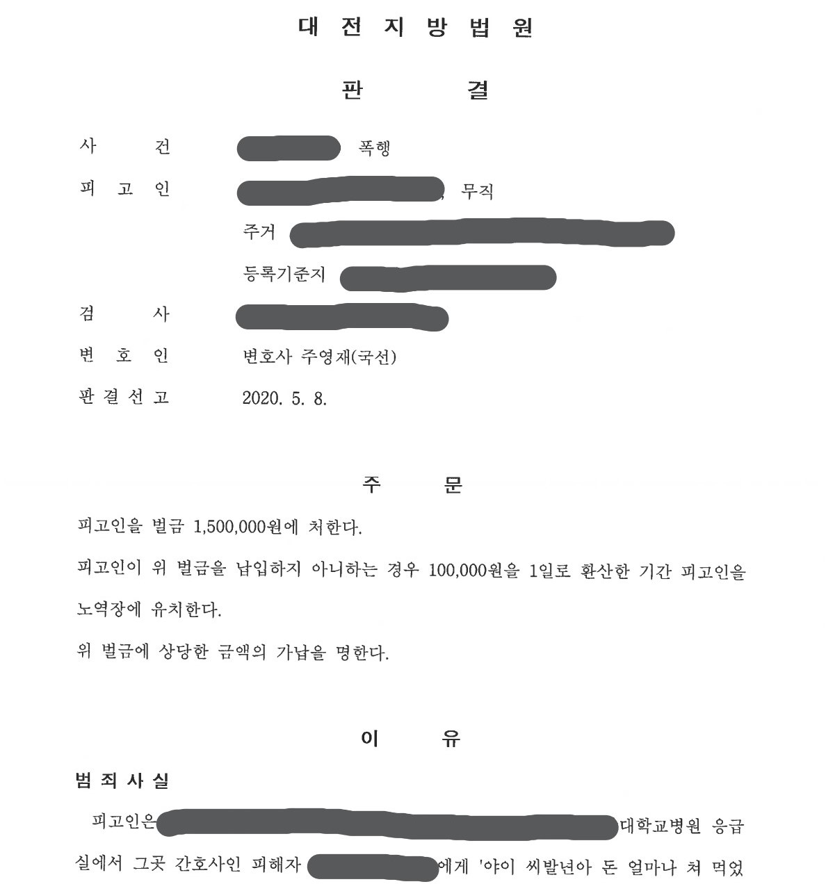 법원은 주영재 변호사의 양형에 관한 주장을 받아들여 피해자와 합의하지 못했음에도 불구하고 약식명령 벌금액의 절반인 150만 원의 벌금형을 선고했습니다.