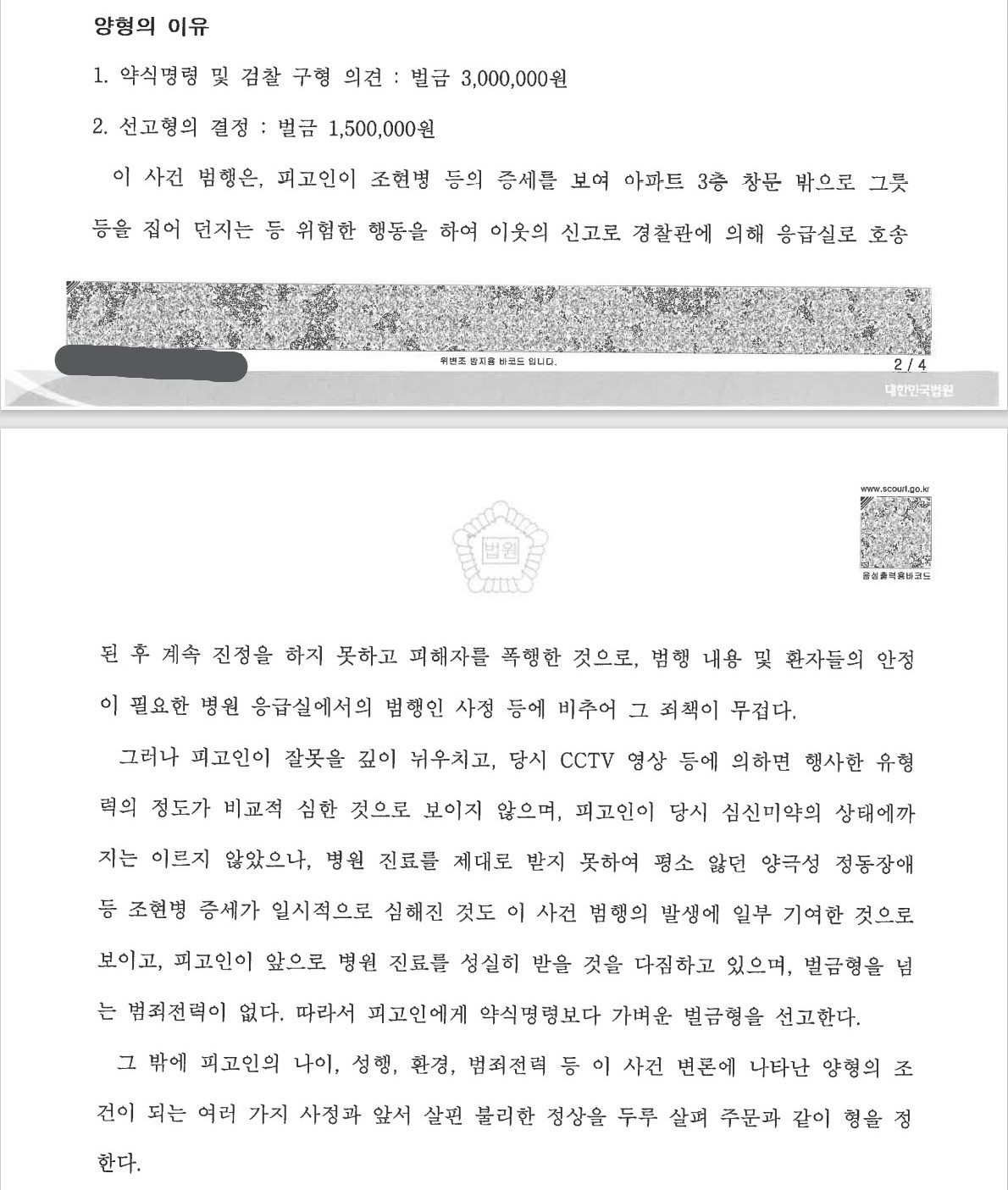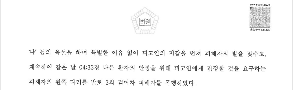 병원 로비에서 대기하고 있던 피고인은 소란을 일으켰고, 이를 제지하는 간호사에게 욕설을 퍼부으면서 간호사의 다리를 3회 발로 걷어찼습니다.