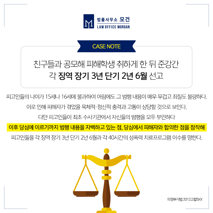 특히 그 어떤 형사사건보다 미성년자 성범죄 사건의 경우 피해학생의 고통과 마음을 깊이 헤아리며 든든한 법적울타리의 역할을 하는 것이 상당히 중요합니다. 법률사무소 모건의 이다슬 대표 변호사는 서울시립청소년드림센터 법률자문위원으로 활동하고 있으며, 학교폭력대책심의위원회, 소년보호재판, 민·형사고소 등 청소년 범죄 사건 해결에 최선을 다하고 있습니다. 상담이 필요하신 분들은 법률사무소 모건으로 문의하시기 바랍니다.