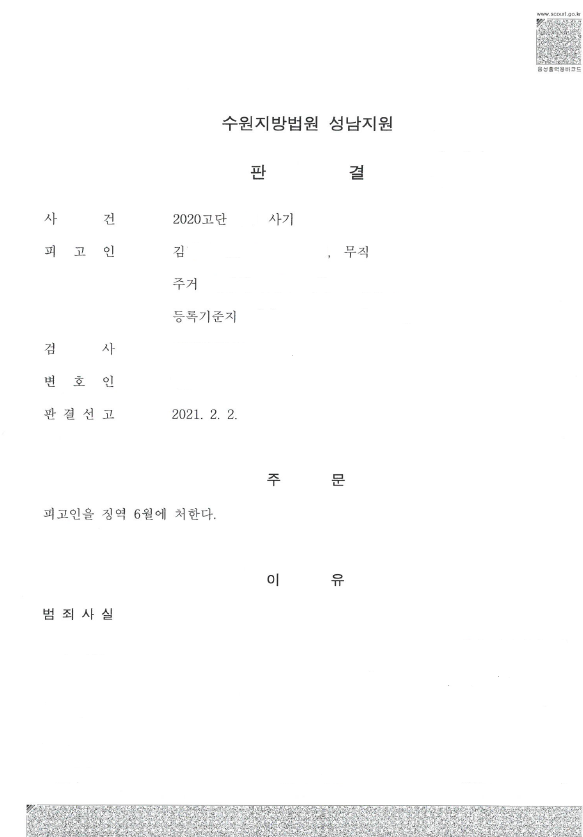 결국 위와 같은 수사결과 X는 8,360만원에 대한 사기죄로 기소가 되었고, 수원지방법원 성남지원에서는 2021년 2월경 X에게 실형 6월을 선고받기에 이르렀고, X는 법정구속을 면하기 위하여 현재 항소제기 후 합의를 진행하고 있는 상황입니다.