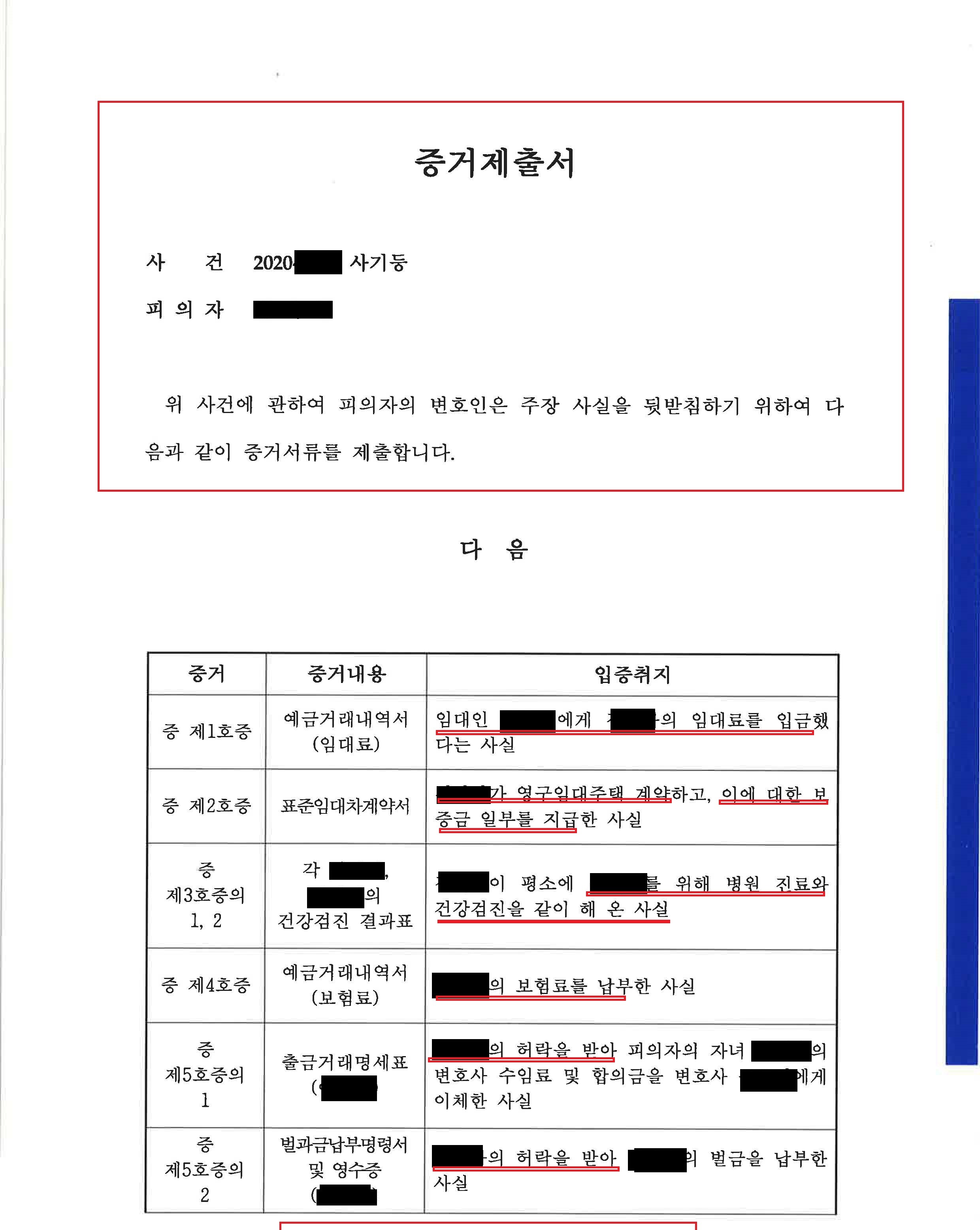 새로운 임대 아파트에 대해서는 임대인에게 임대료와 보증금 일부를 지급하였다는 예금거래내역서 및 표준임대차계약서, 며느리가 평소 새 시어머니를 위해 볍원 진료와 건강검진을 같이 해 온 사실에 대한 건강검진 결과표, 보험료를 납부한 보험료 예금거래내역서, 새 시어머니를 위해 인터넷으로 필요한 물품을 구매한 사실에 대한 인터넷 구매 영수증 등 증거 수집에 주력하였습니다.