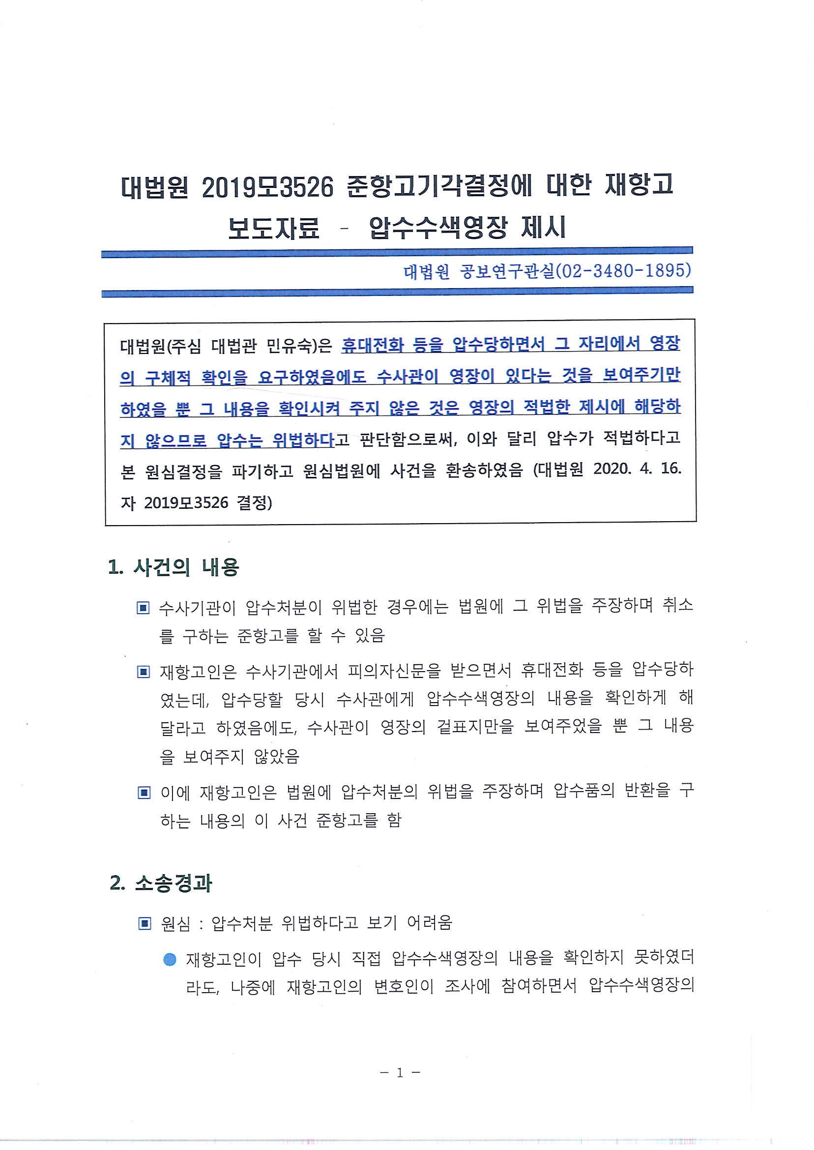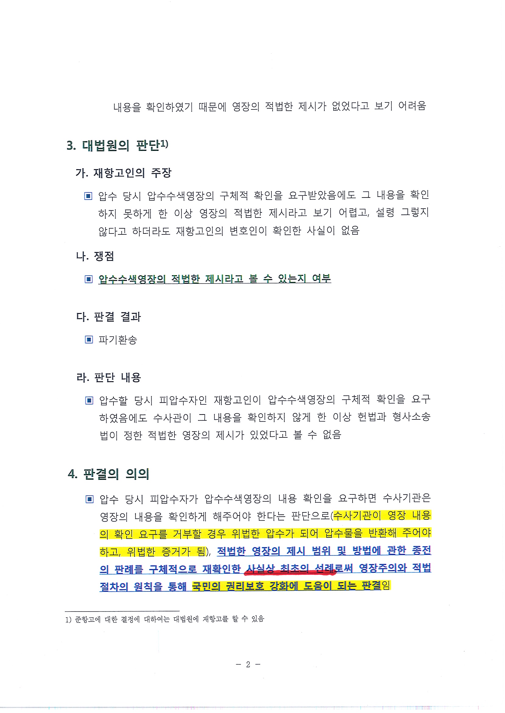 보험 사기 관련 검찰 소환조사를 하면서 압수수색영장을 제시하지 아니하고 핸드폰을 압수한 사건. 이론의 영역에 남아있던 영장 제시에 관하여 대법원에서 최초의 선례를 이끌어냈습니다.