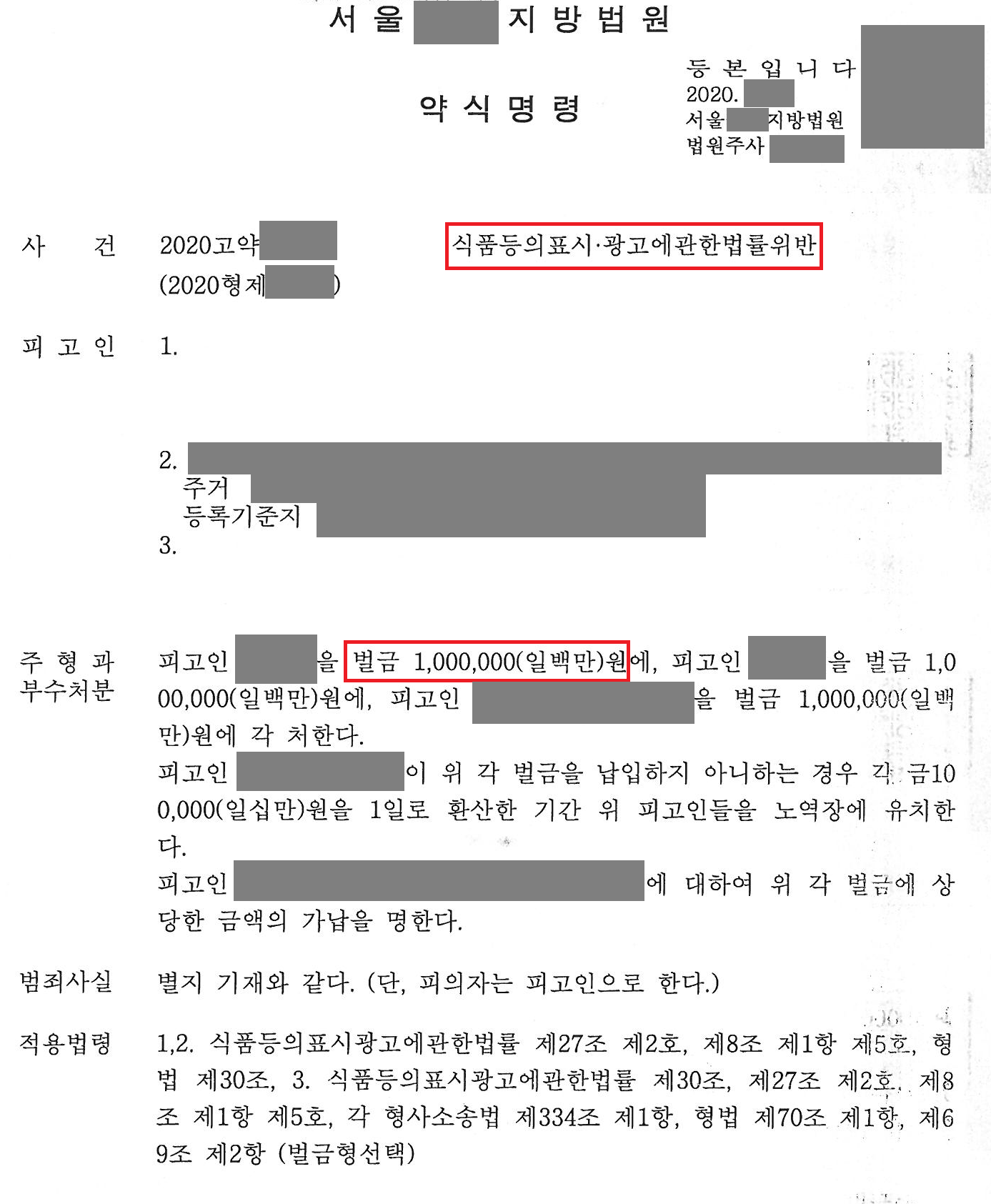 문제가 된 부분은 여러 사람들의 체험기 등을 이용한 형태의 광고였습니다. 온라인을 통해 제품을 판매하는 경우에는 이용자들의 긍정적인 후기를 광고에서 적극적으로 활용하는 일이 다반사인데, 이는 식품표시광고법 시행령에서 엄격히 금지하고 있는 "소비자를 현혹하는 표시·광고"에 해당하기 때문입니다. 저는 일회성 광고에 불과하였고, 문제가 되자 즉시 광고를 삭제하고 사과문까지 게재하였다는 점을 변론하여 선처를 호소하였습니다.