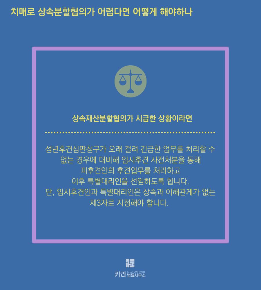 당장 상속재산분할협의가 시급한 상황이라면 임시후견인 선임을 생각해 볼 수 있습니다.