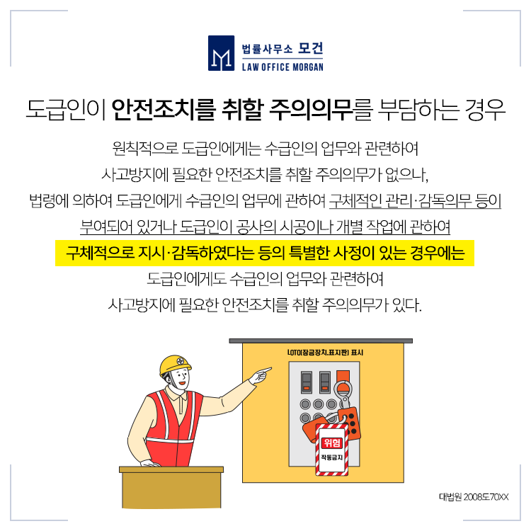 한편 도급주에게도 벌금 500만원이 선고되었는데요. 재판부는 도급주가 도급을 주기는 했으나, 사업의 전체적인 진행과정을 총괄하고 수급인들 사이의 업무를 조율했을 뿐만 아니라 안전보건과 관련한 구체적인 지시까지 한 것으로 보아 이는 '사업의 일부를 분리해 도급을 주어 하는 사업'의 사업주에 해당한다고 보았습니다.