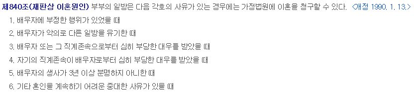 그렇다면 소송에 의해 이혼이 진행되는 경우 어떻게 진행해야 하는지, 내가 위자료는 받을 수 있는지 등에 대해 막막하게 생각하시는 분들이 많을 것 같습니다. 따라서 이번 칼럼에서는 배우자의 외도로 인해 이혼 소송을 생각하고 계신 분들을 위하여 미리 준비해야 할 사항들을 정리해보고자 합니다. 소송을 통하여 이혼을 청구하는 경우 아래와 같이 법에서 정한 재판상 이혼원인이 존재하여야 이혼청구가 받아들여질 수 있습니다.